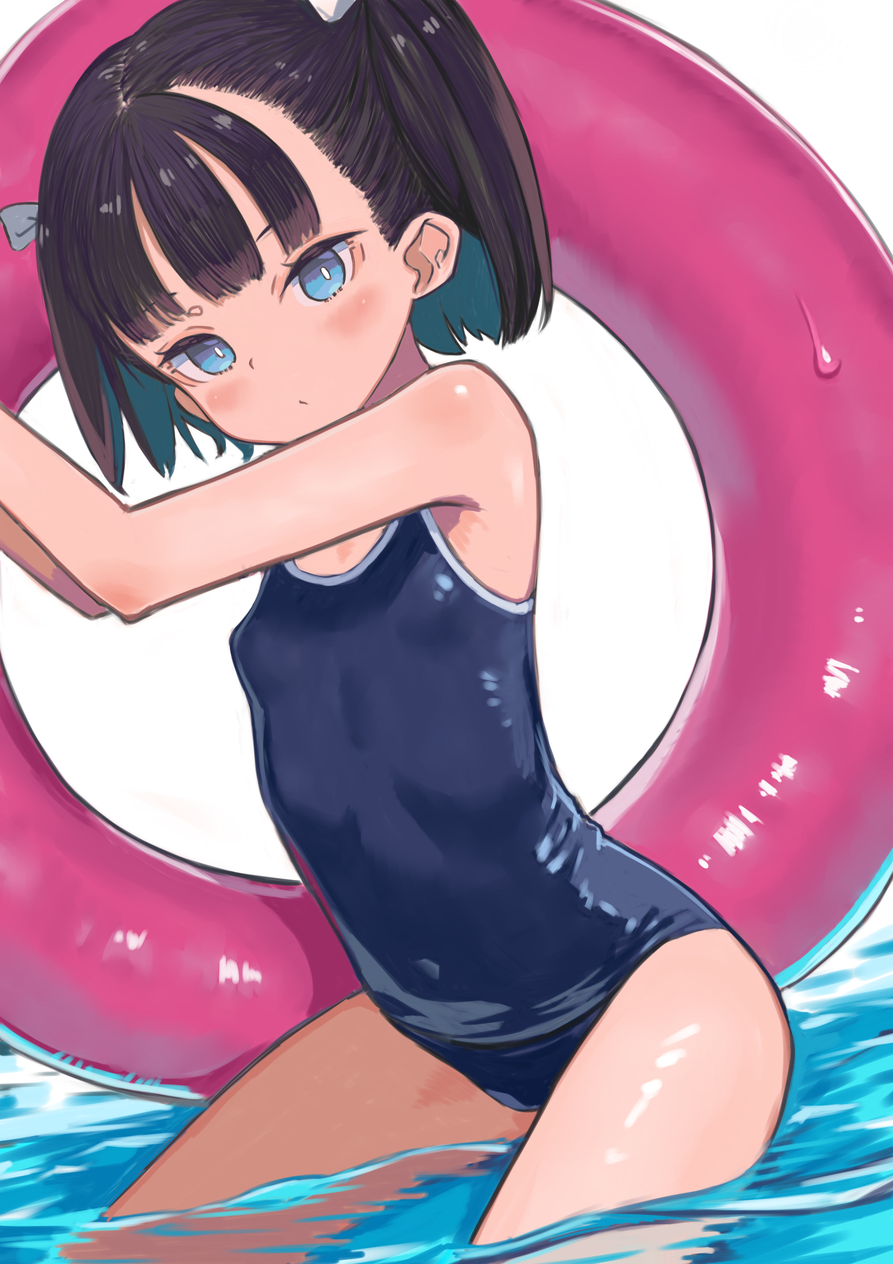 1girlblack hairblue eyesbreastsinnertubelooking at viewerone-piece swimsuitschool swimsuitshort hairsmall breastssoloswim ringswimsuit
