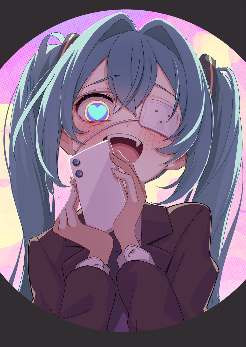 1girlaqua hairblushbrown jacketcellphoneeyepatchheartheart-shaped pupilsholdingholding phonejacketlong hairlong sleeveslooking at vieweropen mouthphonepov peepholesmartphonesolosymbol-shaped pupilsteethtonguetwintailsupper bodyupper teeth only