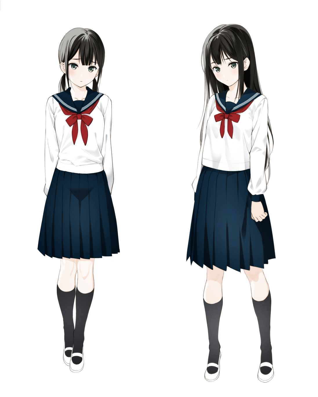 2girlsarms at sidesblack hairblack socksblue sailor collarblue skirtcenter-flap bangsclosed mouthexpressionlessgrey eyeskneehighslong hairlong sleeveslow twintailsmedium skirtmultiple girlsneckerchiefpleated skirtraised inner eyebrowsred neckerchiefsailor collarschool uniformserafukushirtshoessimple backgroundskirtsocksstandingtwintailsuwabakiwhite backgroundwhite shirtwhite shoes