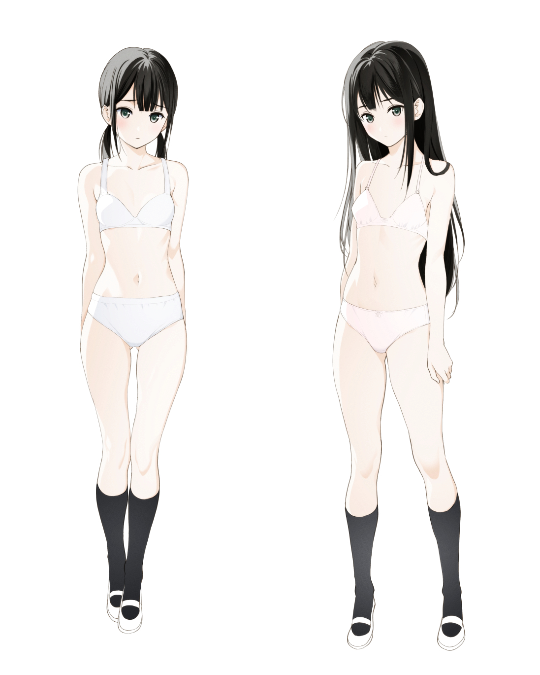 2girlsblack hairblack socksbowbow pantiesbracenter-flap bangsclosed mouthcollarboneexpressionlessgrey eyeskneehighslong hairlow twintailsmultiple girlsnavelpantiesraised inner eyebrowsshoessimple backgroundsocksstandingstomachtwintailsunderwearunderwear onlyuwabakiwhite backgroundwhite brawhite pantieswhite shoes