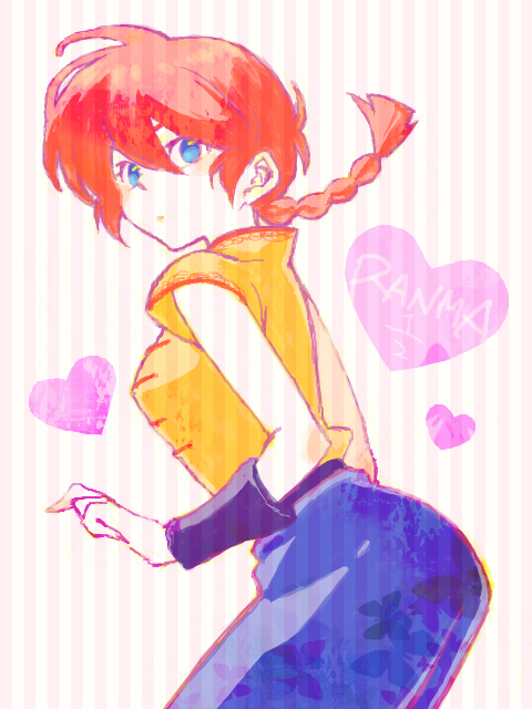 1girlassblue eyesbraidbraided ponytailfemale focusgenderswapgenderswap (mtf)heartlong hairred hairsingle braidsolo