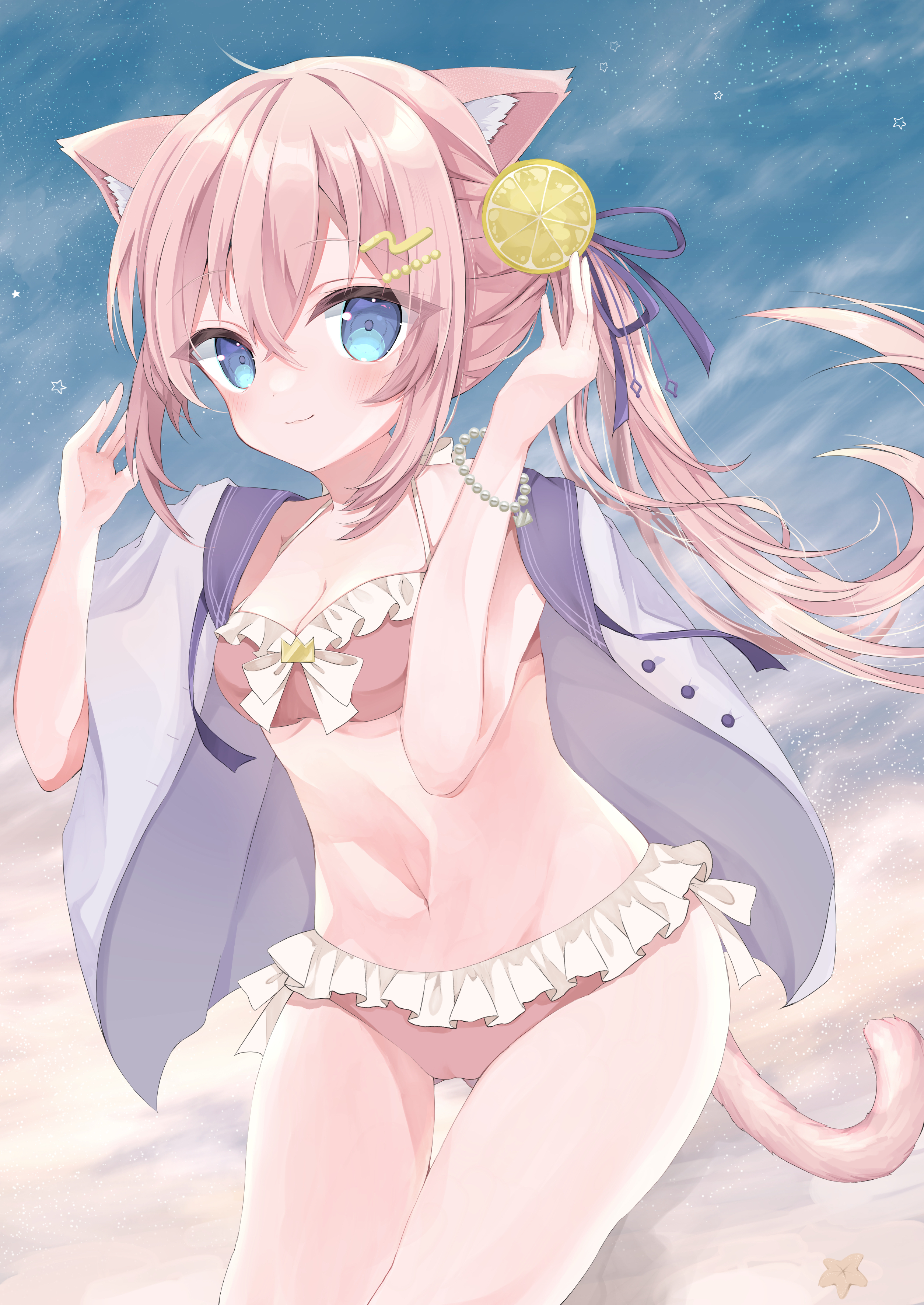 1girlanimal ear fluffanimal earsbikiniblue eyesblushbraceletbreastscat earscat tailcleavageclosed mouthfood-themed hair ornamentfrilled bikinifrillshair between eyeshair ornamenthair ribbonhairclipjacketjewelrylemon hair ornamentlooking at viewermidriffnavelopen clothesopen jacketpink bikiniponytailpurple ribbonribbonsidelockssmilesolostomachswimsuittailwhite jacket