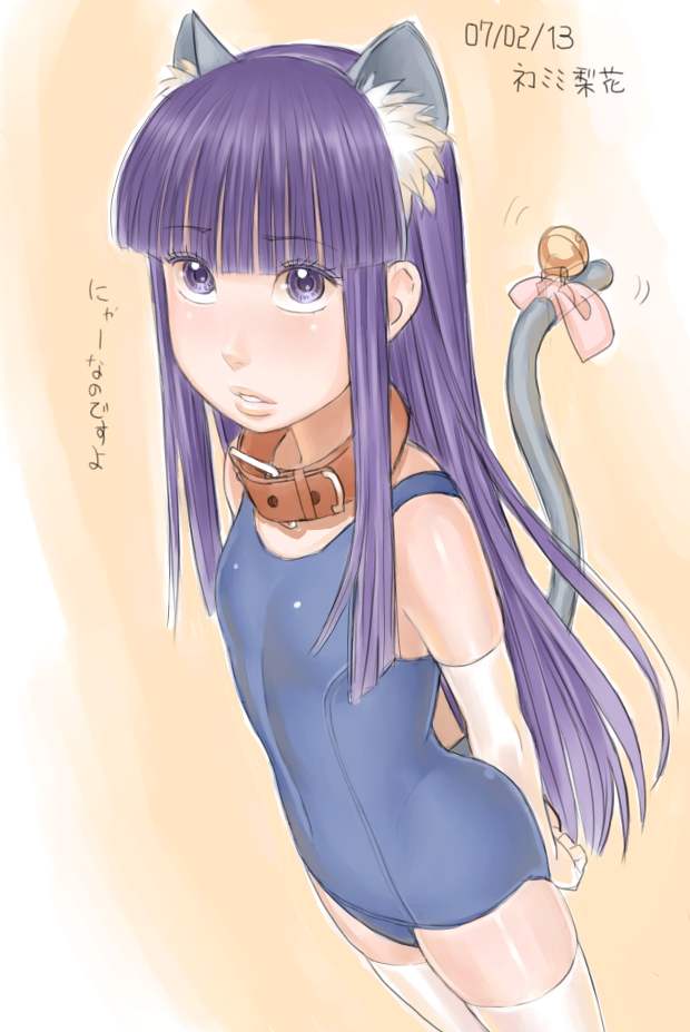 00sanimal earsbellcat earscat tailcollarelbow glovesflat chestgloveslong hairone-piece swimsuitpurple eyespurple hairschool swimsuitsoloswimsuittailthighhighs