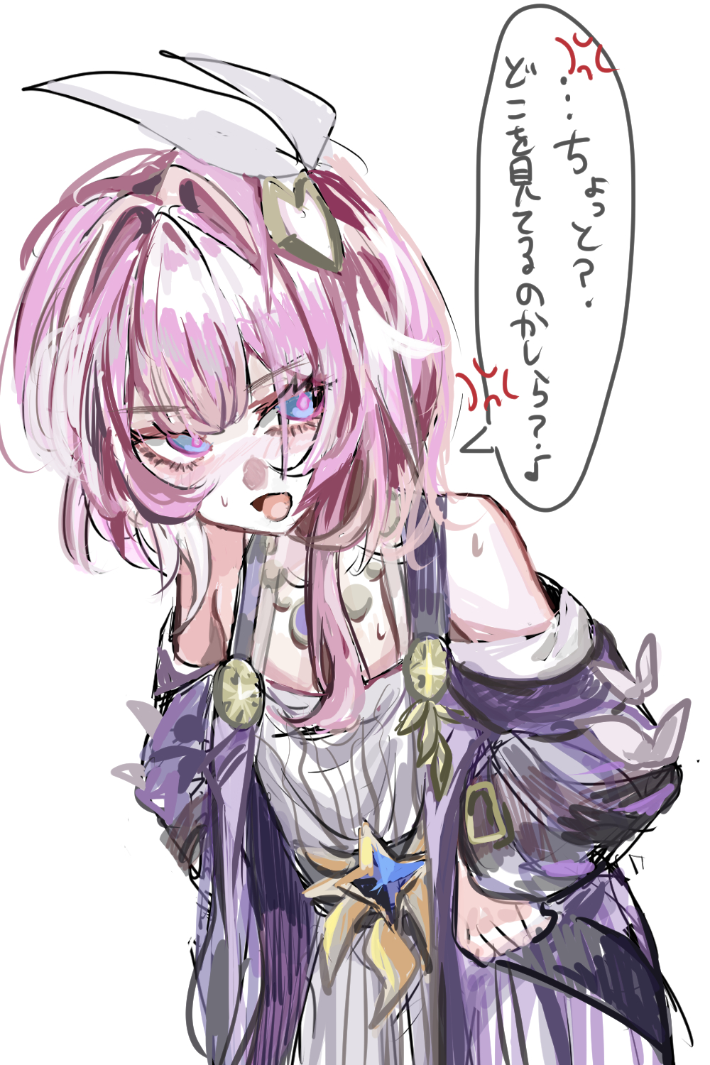 1girlanger veinbreastscoatcyrene (aedes elysiae) (honkai: star rail)dresshair ornamentlooking at viewermulticolored hairopen mouthpink hairpurple coatshort hairsimple backgroundsmall breastssolospeech bubbletwo-tone hairwhite backgroundwhite dresswhite hair