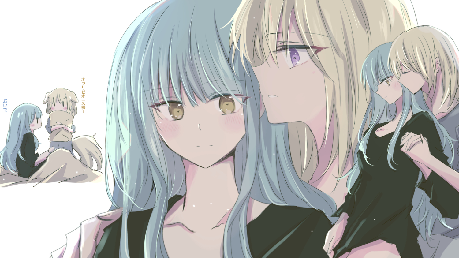 2girls55ddeeanimal earsblack shirtblonde hairblue hairblushdog earsgrey shirthand on another's shoulderholding handskemonomimi modelong hairmedium hairmultiple girlspajamaspurple eyesshirtyellow eyesyuri