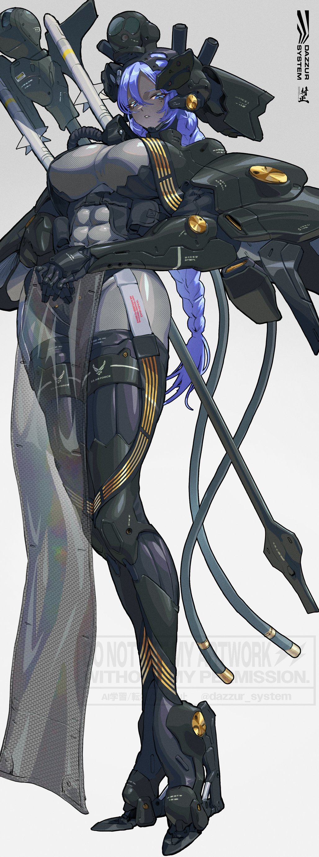 1girlabsartist logoartist nameblue eyesbraidbreastscyborgdark skindark-skinned femalefull bodygrey backgroundlarge breastslogolong hairlooking at viewerparted lipspelvic curtainpurple hairsee-through clothessee-through pelvic curtainsimple backgroundsolowatermark