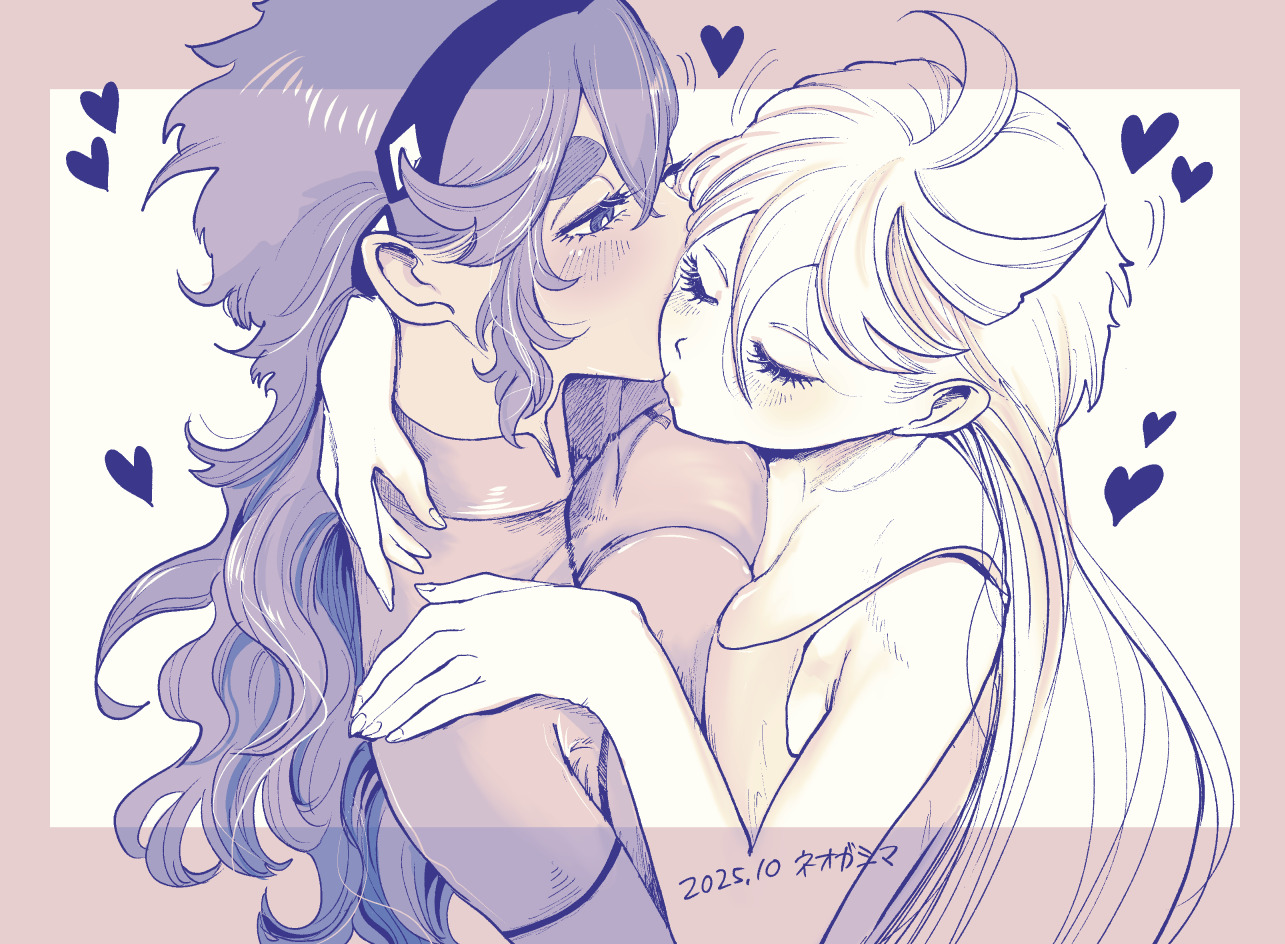 2girlsarm around neckblushbodysuitbreast presscamisoleclosed eyeshairbandheartkisskissing cheeklong hairmonochromemultiple girlsthick eyebrowsyuri
