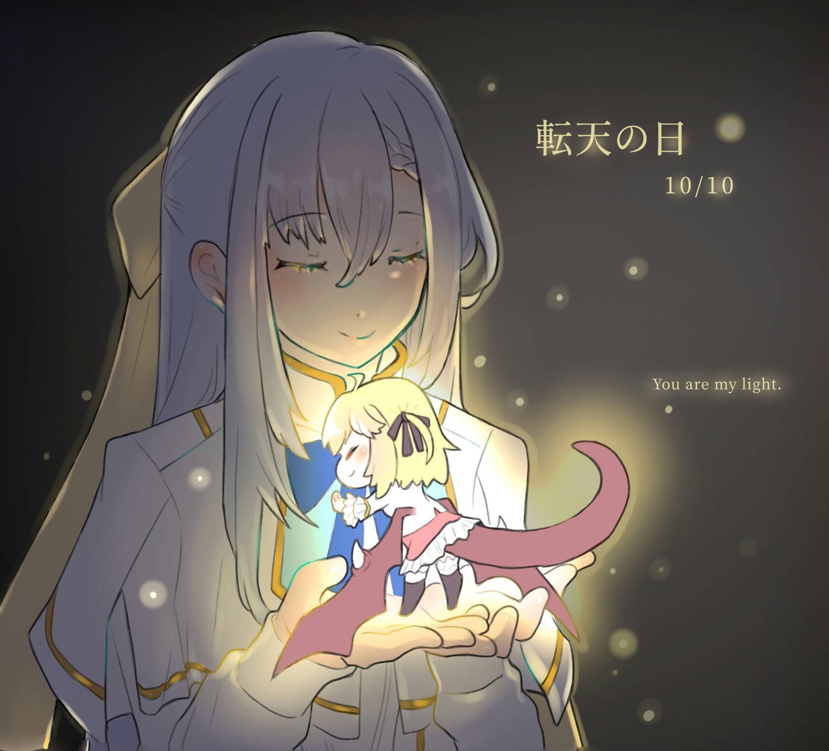 2girlsbaahowlblack ribbonblack socksblonde hairblue bowblue bowtiebowbowtieclosed eyesclosed mouthdragon girldragon taildragon wingsgrey hairhair ribbonjacketkneehighslong hairmedium hairmini personminigirlmultiple girlspink skirtribbonskirtsmilesockstailwhite jacketwingsyellow ribbon