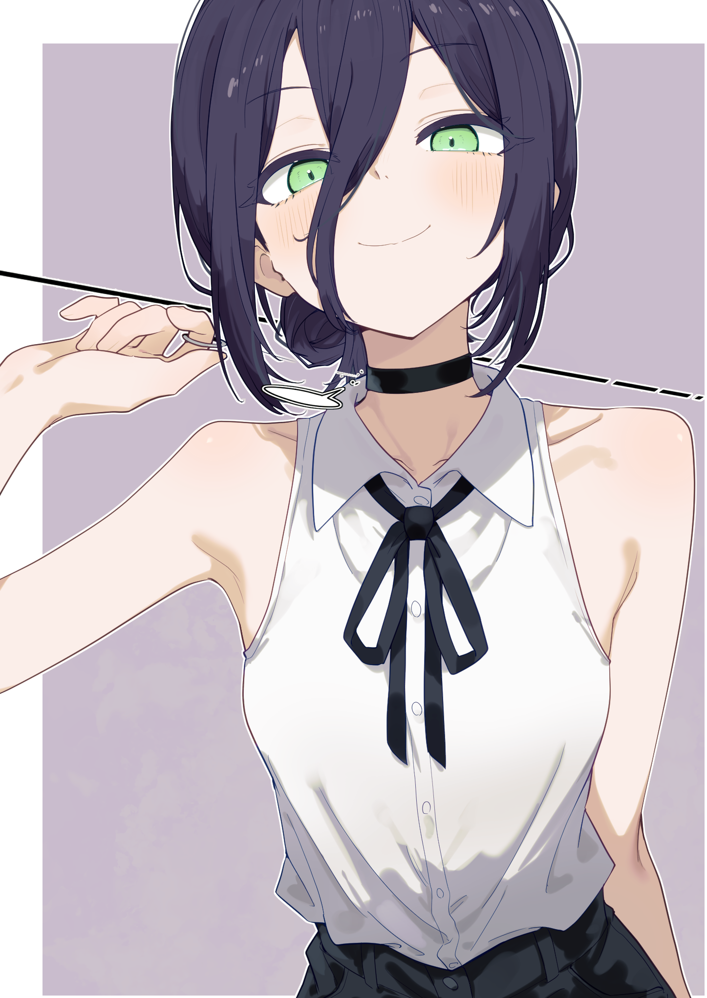 1girlarmpitsblack chokerblack hairblack ribbonblushchokercollarbonegreen eyesgrenade pinhair between eyeslong hair between eyeslooking at viewerneck ribbonribbonshirtshirt tucked insimple backgroundsleevelesssleeveless shirtsmilesoloupper bodywhite shirt