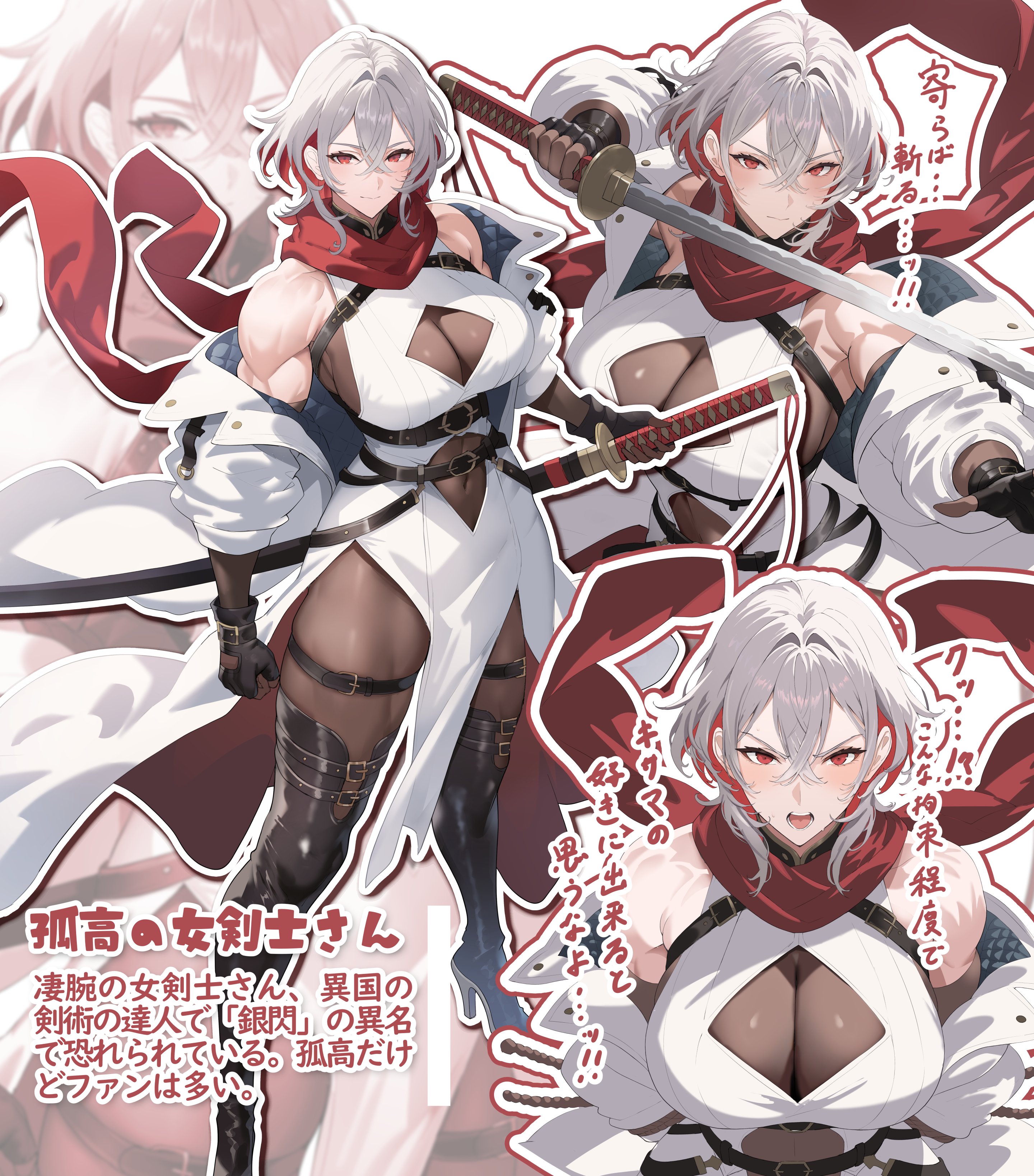 1girlbare shouldersblack bootsblack glovesblushbodystockingbootsbreastscleavagecleavage cutoutclothing cutoutcoatfingerless glovesfull bodyglovesgrey hairhair between eyeshigh heel bootshigh heelsholdingholding swordholding weaponlarge breastslong sleevesmedium hairmulticolored hairmultiple viewsmuscularmuscular femalenavelootachiopen mouthred scarfred streaksscarfsheathsheathedstreaked hairswordthigh bootsthigh straptwo-tone hairweaponwhite coat