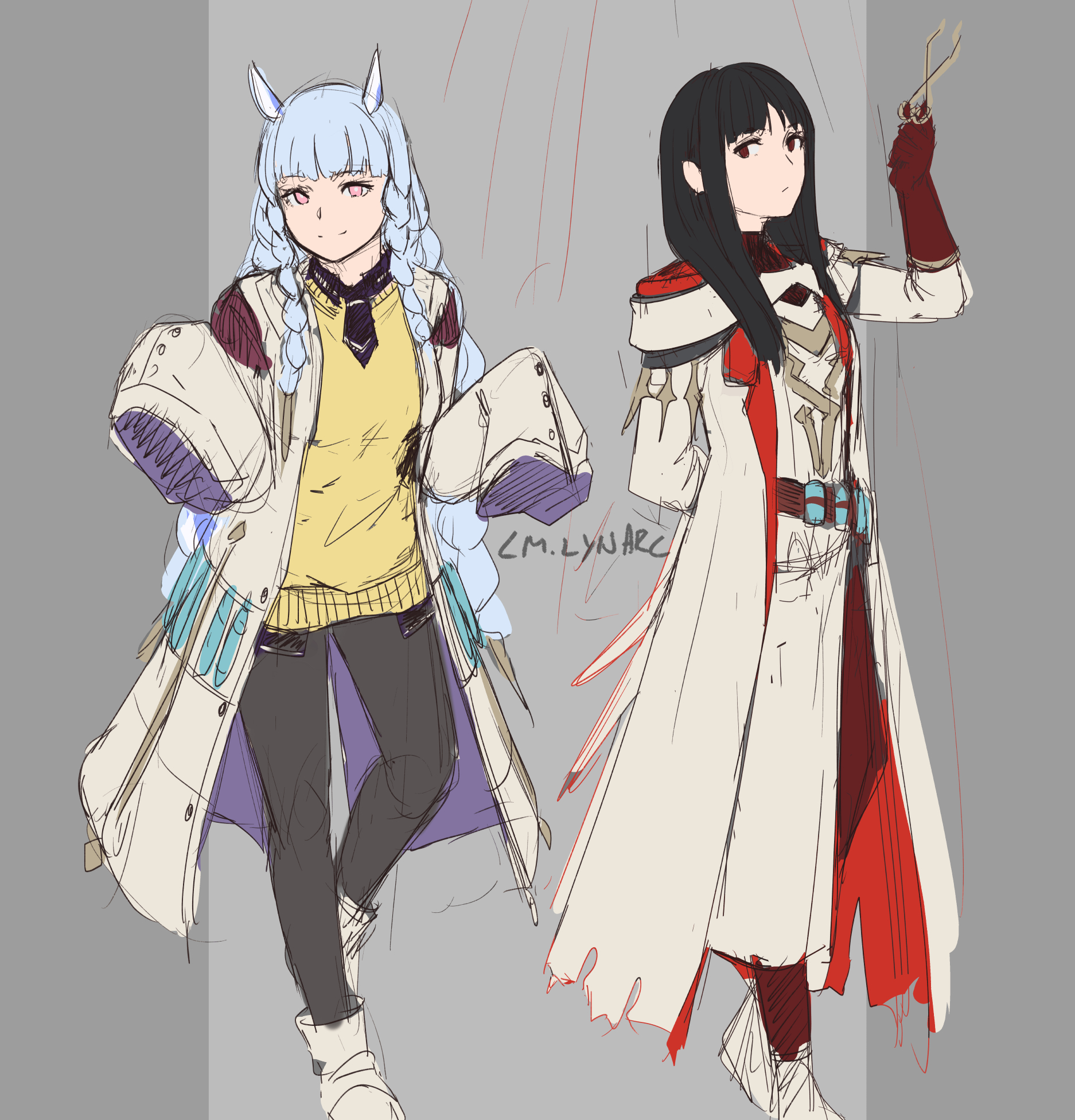 2girlsagnes tachyon (umamusume) (cosplay)animal earsartist nameblack hairblack pantyhoseblue hairbootsbraidclosed mouthcosplayflowerglovesholdingholding scissorslab coatlong coatlong hairlong sleeveslooking at viewermultiple girlsnecktiepantyhosepink eyesred eyesred glovesscissorssketchsleeves past fingerssleeves past wristssmilesweater vestvery long hairwhite bootsyellow sweater vest