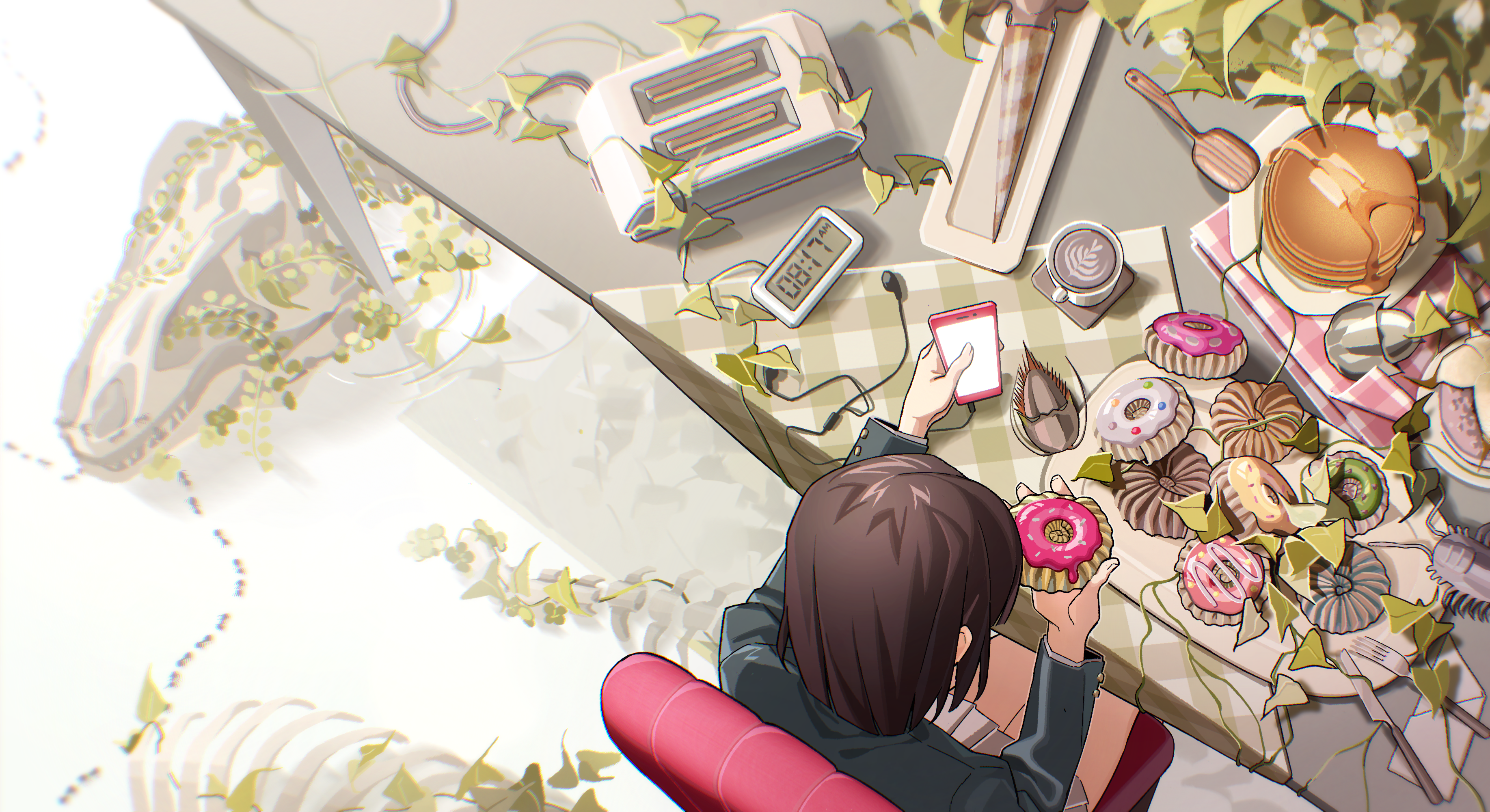1girlammoniteanimal skullblack hairbonecellphonechromatic aberrationclockdigital clockdinosaur skeletonearbudsearphonesflowerfoodforkfrom abovegrey skirtholdingholding phoneicingjigsaw (pixiv69502009)knifelatte artpancakephoneplantplatesittingskirtsmartphonespoonsurrealtabletoastertrilobitevineswhite flowerwooden spoon