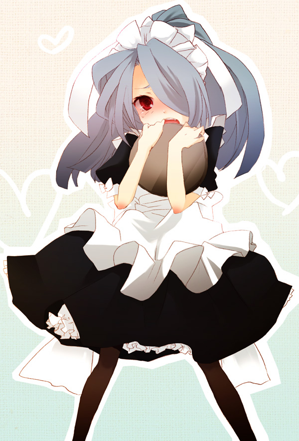 00sapronblue hairblushchildhair over one eyemale focuspantyhosered eyesribbonsolotearstraptraywaitress