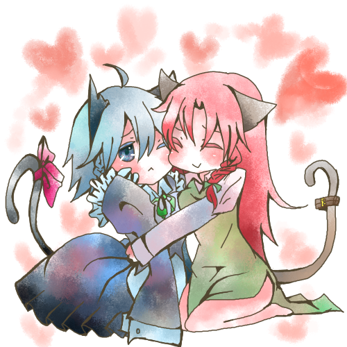 onimaru gonpei, hakurei reimu, kirisame marisa, touhou, 2girls, annoyed, blonde hair, blush, brown hair, cheek-to-cheek, female focus, happy, heads together, heart, hug, multiple girls, open mouth, red eyes, smile, tears