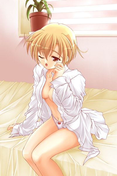 1girlbedblonde hairfemale focuslong sleevesone eye closedopen clothesopen mouthpantiesplantpotted plantshort hairsleepysleeves past wristssolounderwearwink