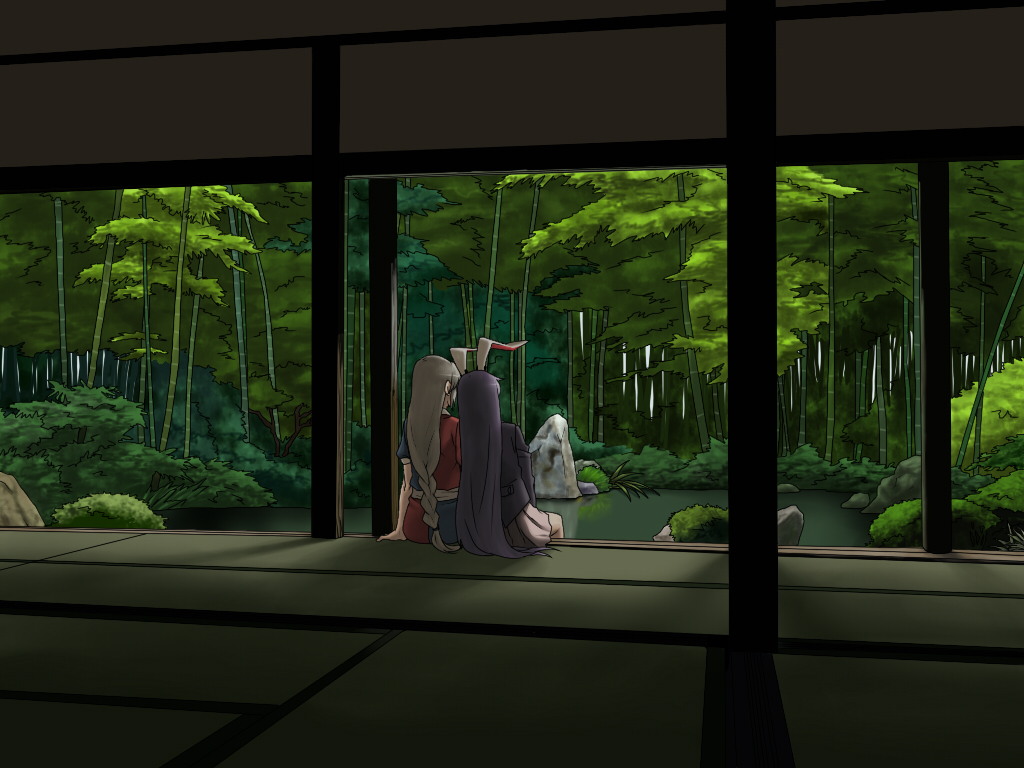 2girlsanimal earsbamboobamboo forestbraidcouplefemale focusforestfrom behindleaninglong hairmultiple girlsnatureno headwearpondporchpurple hairrabbit earssittingtatamiverandawateryuri