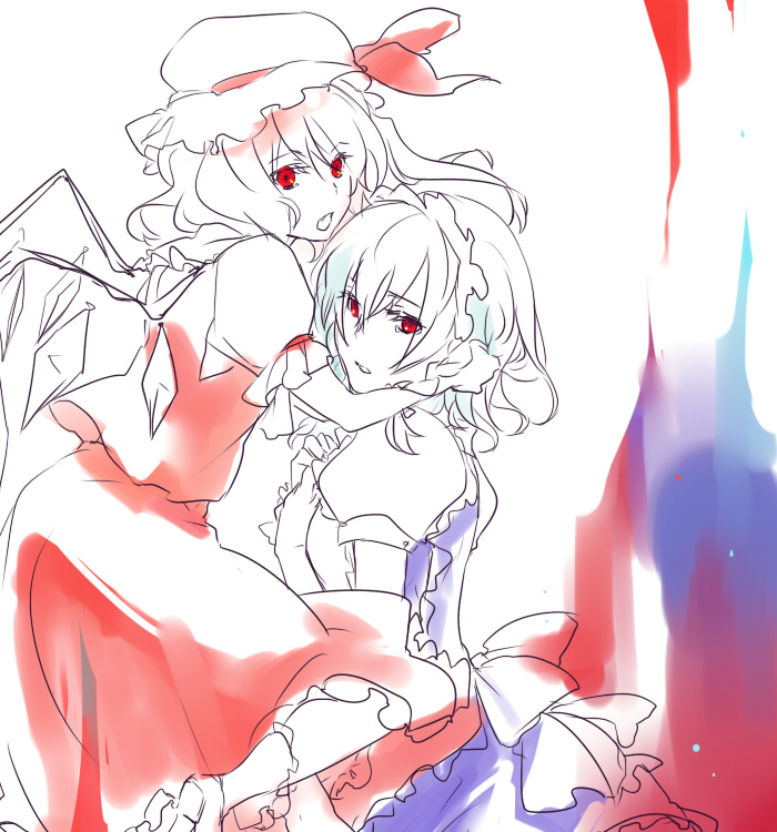 2girlsfemale focushairbandhathugmaidmob capmonochromemultiple girlsmultiple monochromered eyesribbonshort hairspot colorwhite backgroundwings
