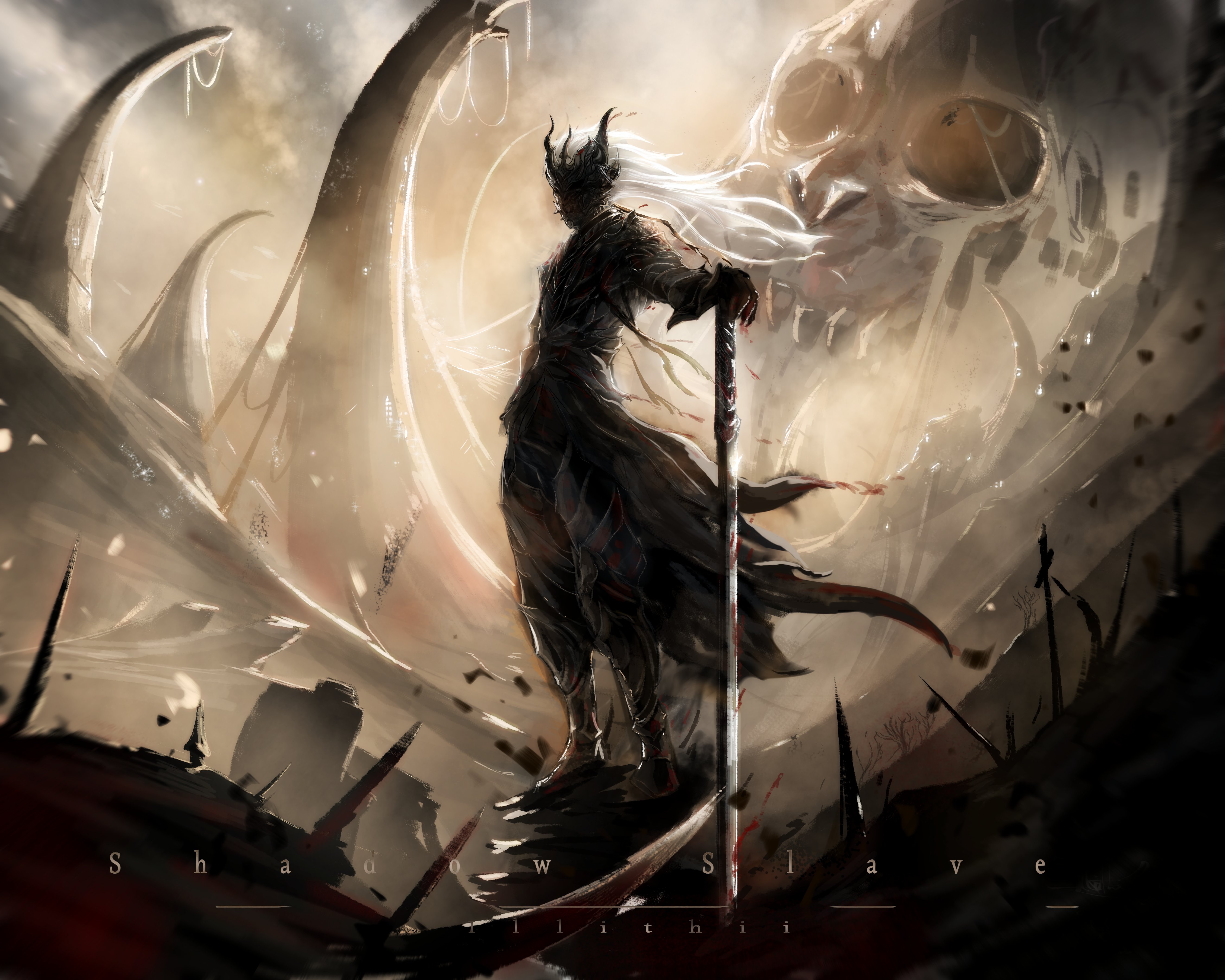 1boyblack bootsblack glovesblack robeblack tunicbootscopyright namedemon hornsfull bodygloveshair flowing overholdingholding swordholding weaponhornsillithiimale focusmaskofficial alternate costumepainterlyplantedplanted swordplanted weaponribsroberuinsskullsolostandingswordtunicwastelandweaponwhite hairwind