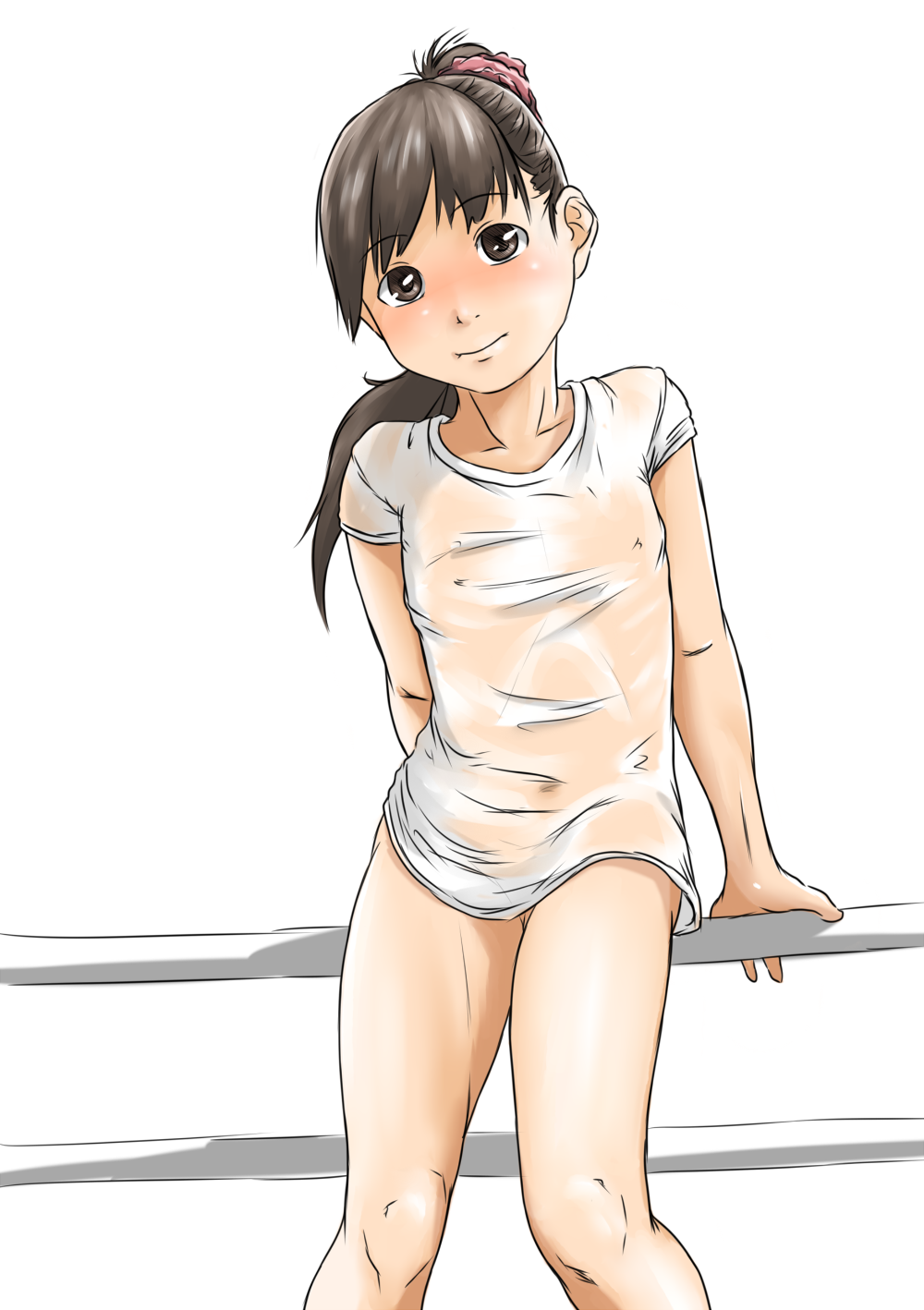 1girlbare legsblushbottomlessbrown eyesbrown hairdress shirtfemale focusflat chestlolilong hairno braponytailsee-through clothesshirtsolowhite background