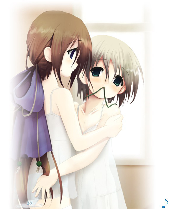 kairakuen umenoka, hiiragi kagami, izumi konata, lucky star, brown footwear, white legwear, 00s, 2girls, ahoge, back-to-back, black socks, blue eyes, blue hair, blue sailor collar, bow, bowtie, chocolate cornet, closed eyes, field, food, full body, grass, kneehighs, loafers, looking back, mole, mole under eye, multiple girls, outdoors, pink hair, profile, sailor collar, school uniform, serafuku, shoes, simple background, sitting, socks, twintails, white background, yellow bow, yellow bowtie