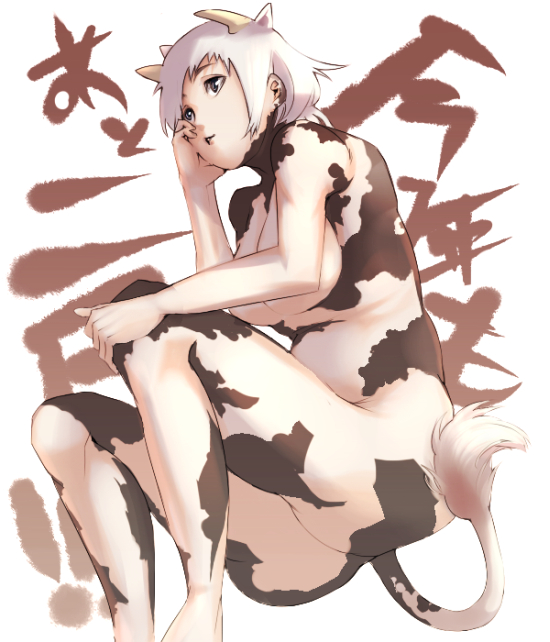 1girlanimal earsanimal printasscow earscow girlcow printcow tailfemale focushornslyingnudeshort hairsolotailwhite hair