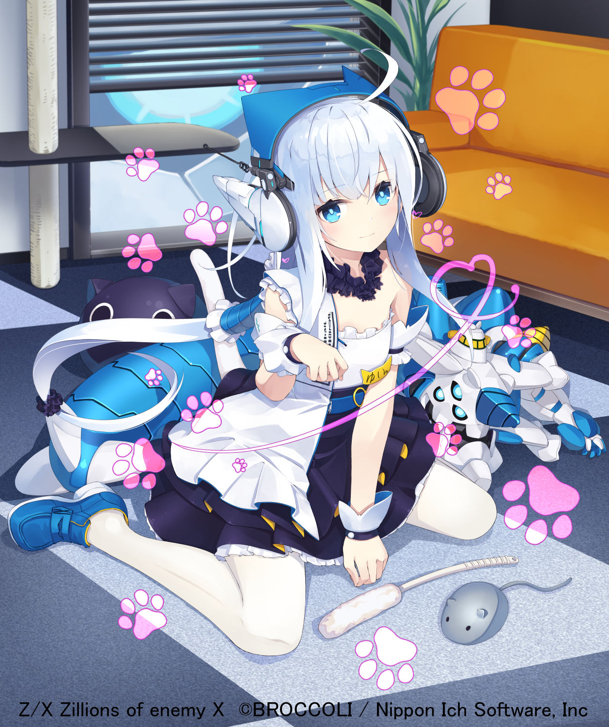 1girlahogeanimal ear headphonesanimal earsblue eyesblue shoescat ear headphonescat earscat teaserclosed eyescopyright noticecouchdressfake animal earsgrey hairheadphonesheartindoorslong hairname tagpantyhosepaw printshoessittingstuffed toytoy mousewarizawhite pantyhoseyui (z/x)