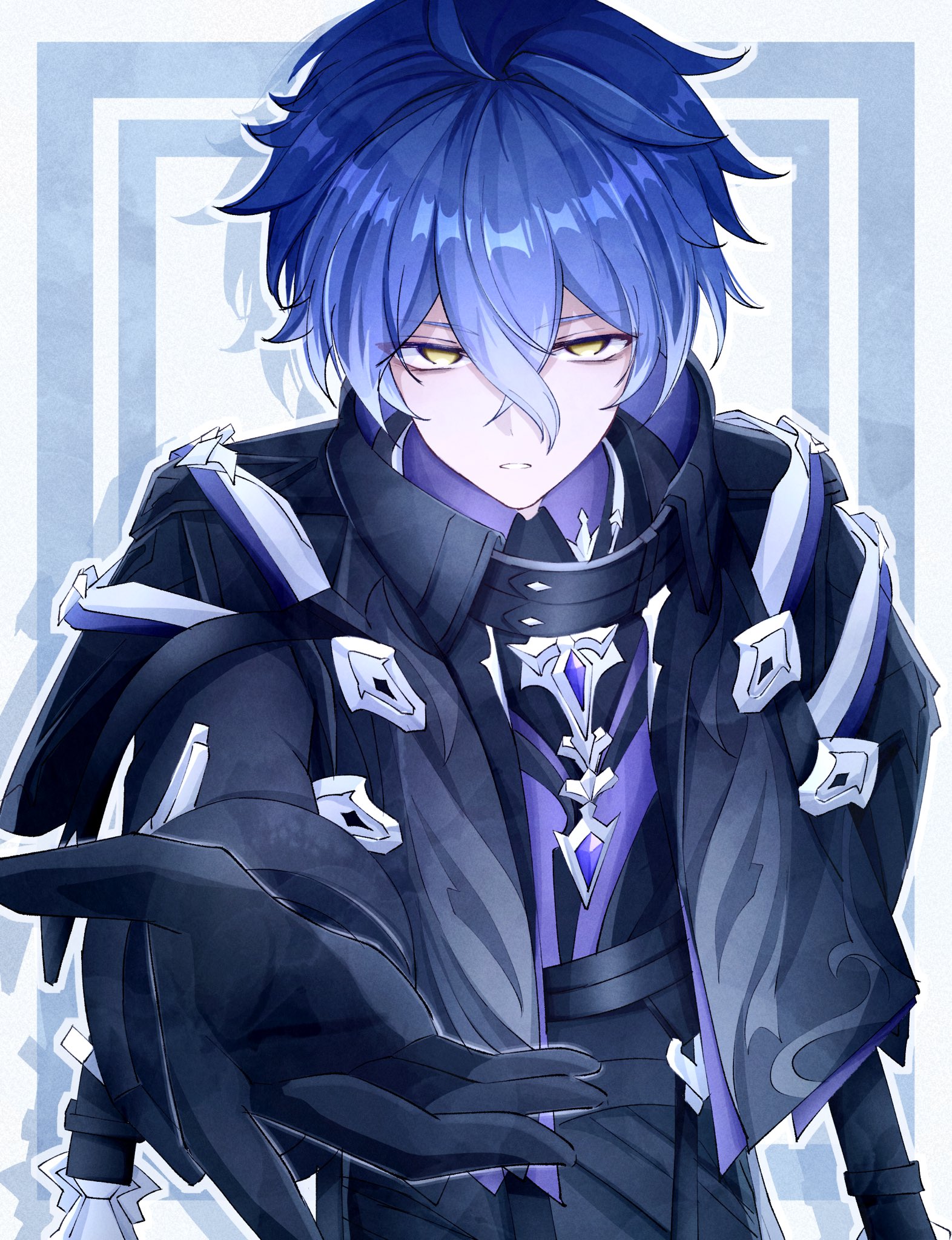 1boyblack coatblack glovesblue haircoatcollared coatglovesgradient hairhair between eyeskuro774 nlooking at viewermale focusmulticolored hairno pupilsparted lipsreachingreaching towards viewersolotwo-tone backgroundupper bodyyellow eyes