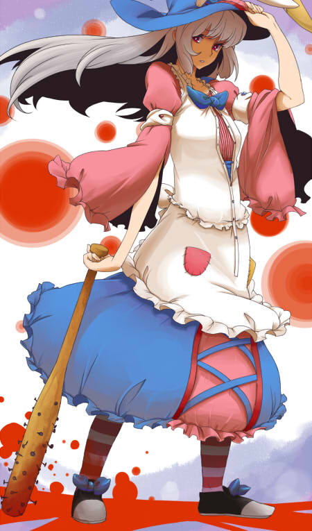 1girlanimal earsapronbaseball batfemale focusfrillshatlong hairrabbit earsred eyessolowitch hat