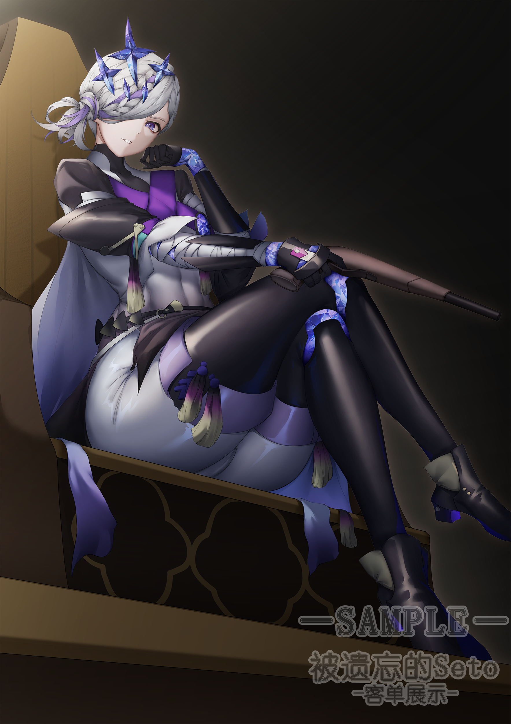 1girlartist namebandaged armbandagesblack bootsblack glovesblack thighhighsbootsbraidchinese textcrossed legsdated commentaryglovesgrey hairgunhair over one eyehand on own chinholdingholding gunholding weaponlong bangslooking at viewermulticolored hairofficial alternate costumeopen mouthpurple eyesshort hairsimple backgroundsittingsolostreaked hairthighhighsthighsweapon