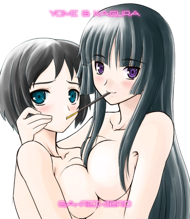 00s2girlsblack hairblue eyesblunt bangsbreast pressbreastsfoodhime cutlarge breastsmouth holdmultiple girlspockypurple hairsymmetrical dockingtopless female