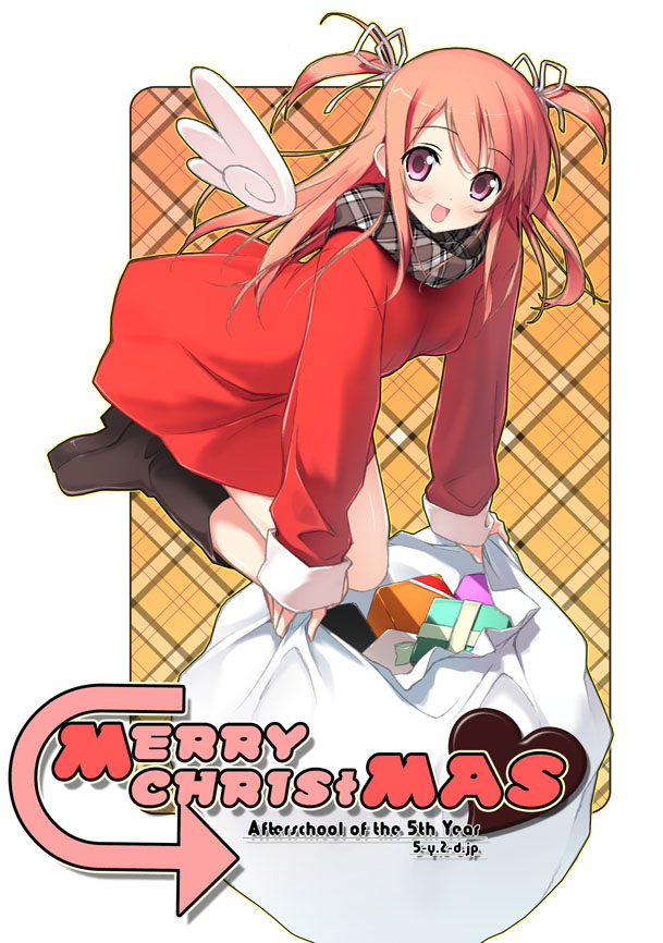 1girlchristmasfemale focusflyinghair ribbonjumpingplaid backgroundplaid clothesplaid scarfpurple eyesred hairribbonsackscarfsolotwo side upwings