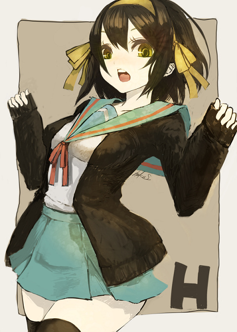 00s1girlbrown haircardiganeyelashesfemale focush (letter)hairbandlong sleevesopen mouthschool uniformserafukushort hairsleeves past wristssolothighhighsyellow eyeszettai ryouiki