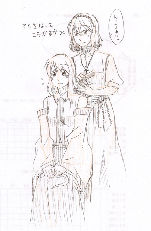 2girlsbrown themecombdetached sleevesfemale focushairbandjapanese clothesmikomonochromemultiple girlsshort hairsketch