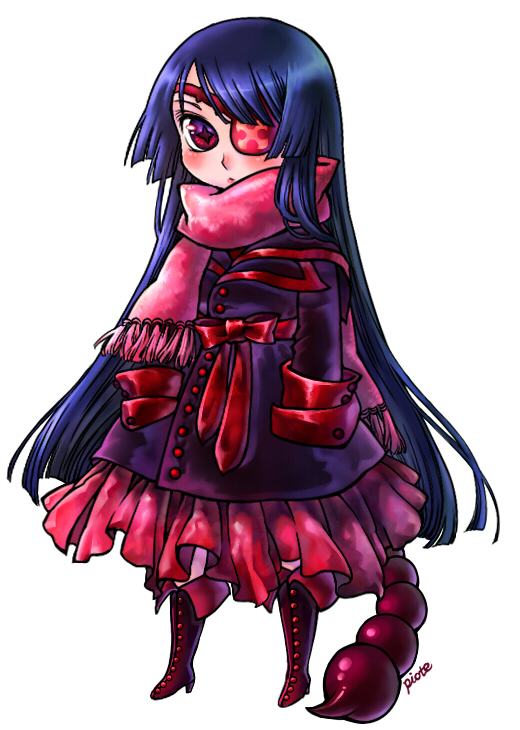 00s1boy1girlblue hairbowchibicoateyepatchfemale focusfrillslong hairred eyesscarfscorpion tailsolotailvery long hair