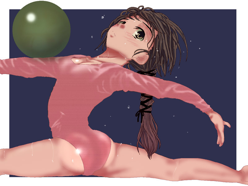 1girlassballblushbrown eyesbrown hairfemale focusgymnasticshair ribbonleotardlong hairponytailrhythmic gymnasticsribbonsolosplit