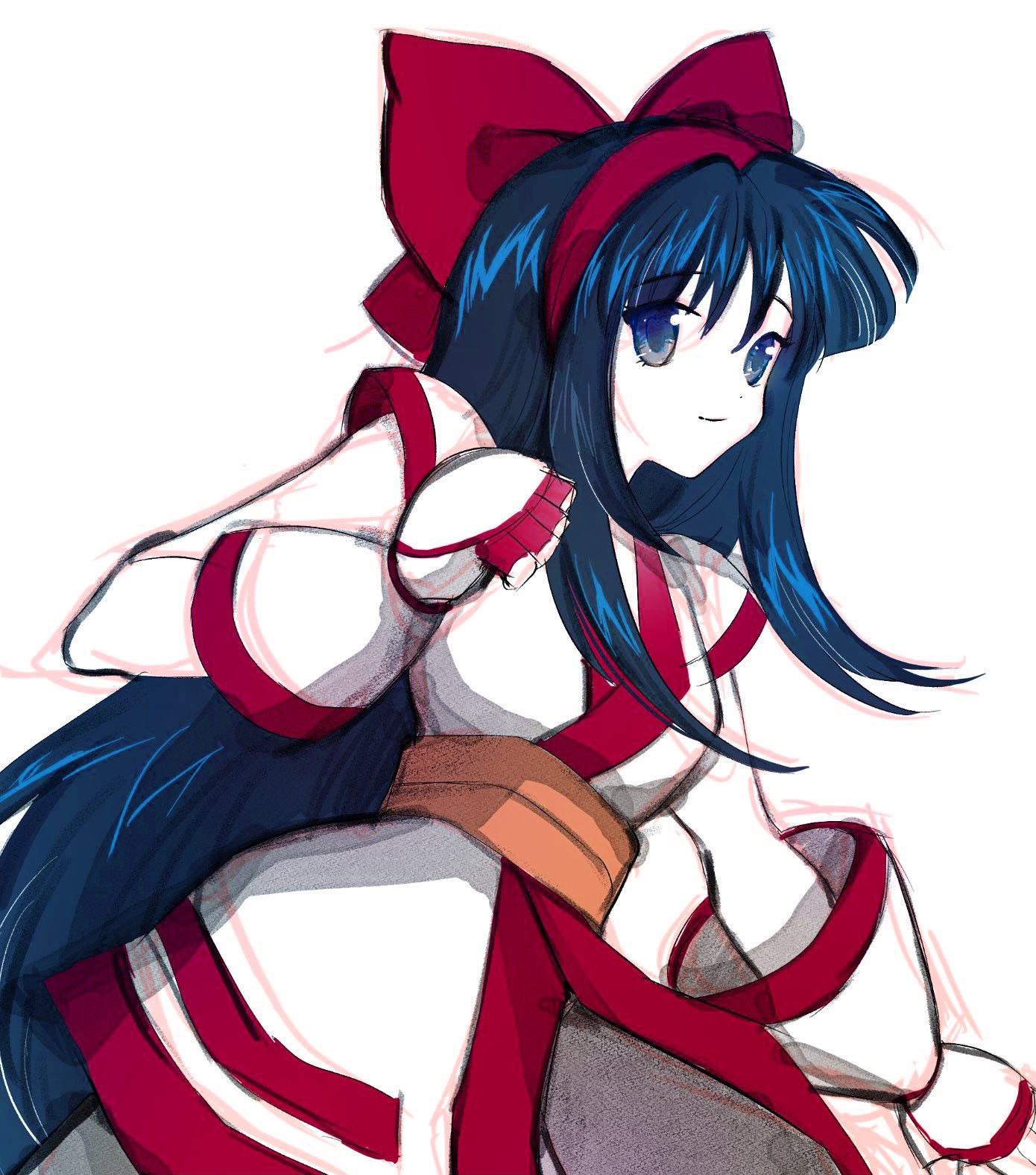 1girlainu clothesblue eyesblue hairbreastsclenched handfingerless glovesgloveshair ribbonlarge breastslegslong hairlooking at viewerpantsribbonsmilesolothighs