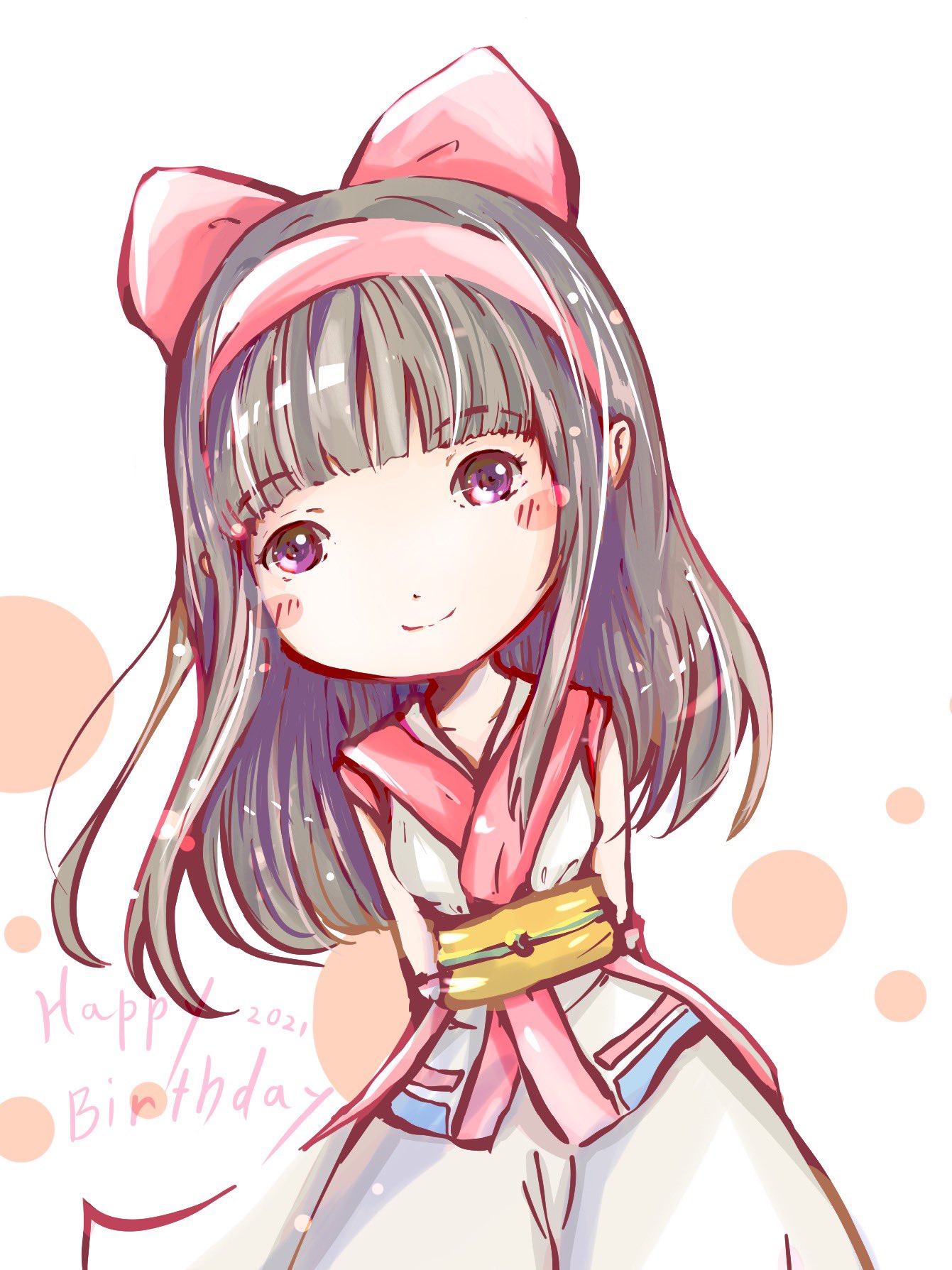 1girlainu clothesarms behind backblack hairbreastsdatedenglish texthair ribbonlong hairlooking at viewermedium breastspurple eyesribbonsolo