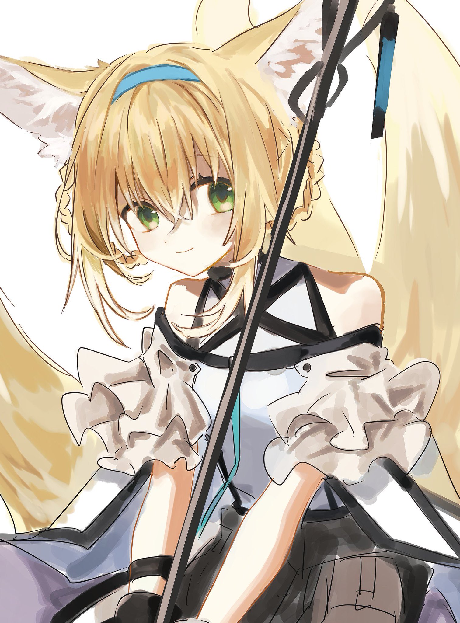 1girlanimal earsbare shouldersblack glovesblonde hairblue hairbandbraidbraided hair ringsclosed mouthfox earsfox girlfox tailglovesgreen eyeshair ringshairbandholdingholding stafflooking at viewernktgshort hairsimple backgroundsolostafftailtwin braidswhite background