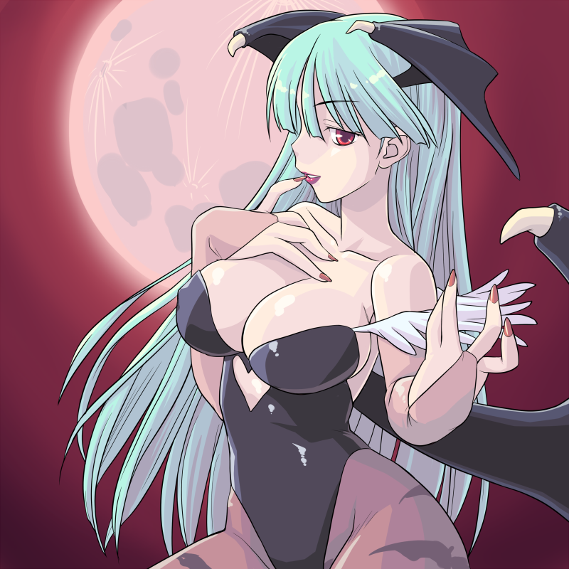 1girlanimal printbat printbat wingsblue hairbreastscleavagedetached sleevesfemale focusgreen hairhead wingslarge breastslipsticklong hairmakeupmoonnail polishpantyhoseprint pantyhosered eyessolowings