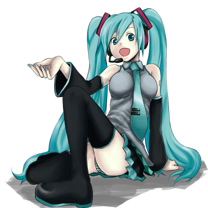 1girlaqua eyesaqua hairaqua nailsbare shouldersbootsbreastsdetached sleevesfemale focusheadphoneslong hairmicrophonenail polishnecktiepantiesskirtsolostriped clothesstriped pantiesthigh bootsthighhighstwintailsunderwearupskirtvery long hair