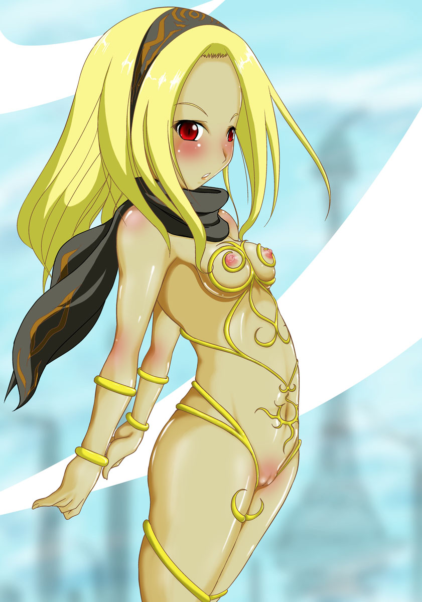 utsugi tsuguha, riesz, seiken densetsu, seiken densetsu 3, 1girl, blonde hair, blue eyes, blush, breasts, brooch, brown gloves, cleavage, collarbone, elbow gloves, female focus, gem, gloves, jewelry, looking at viewer, solo, upper body