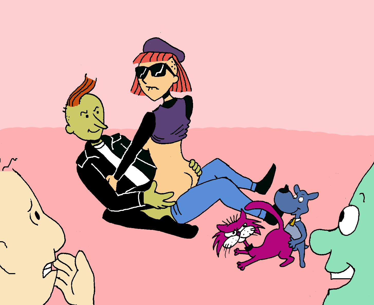 mousse (duck) (ranma 1/2), saotome genma (panda), saotome ranma, shampoo (ranma 1/2), ranma 1/2, absurdres, commentary request, highres, 1girl, 2boys, abdooly111, apron, bell, bird, black hair, braid, braided ponytail, breasts, chair, cheek bulge, china dress, chinese clothes, chopsticks, closed eyes, dress, duck, eating, egg (food), feathers, floating hair, food, glomp, hair bell, hair ornament, holding, holding chopsticks, hug, imminent hug, indoors, jumping, kamaboko, large breasts, long hair, maid apron, maid headdress, meat, multiple boys, narutomaki, noodles, on chair, open mouth, panda, pink dress, purple hair, red shirt, red shoes, restaurant, shirt, shoes, short sleeves, sidelocks, single braid, sitting, spilling, steamed bun, white apron