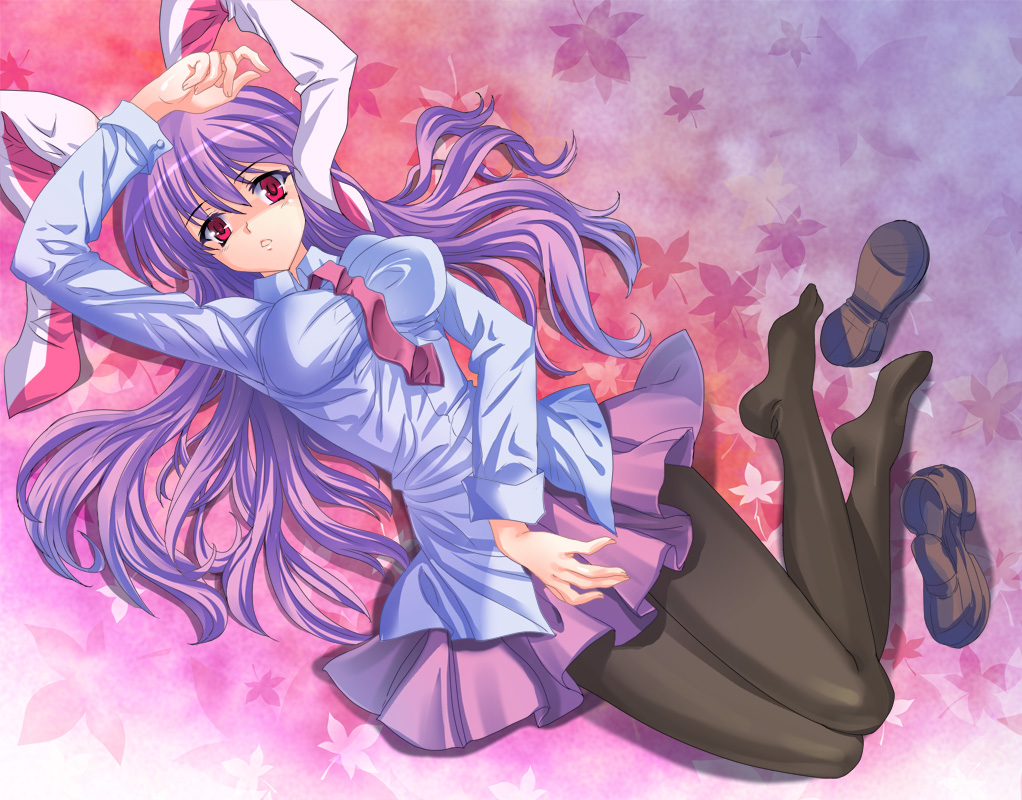 aestivation, original, commentary request, highres, 1girl, ankle boots, arm up, arms up, black hair, black ribbon, black shirt, blue bow, blue hair, blurry, blurry foreground, boots, bow, frilled shirt, frills, grey eyes, hair bow, high-waist skirt, indoors, long hair, looking to the side, multicolored hair, one eye closed, picture frame, ribbon, shadow, shirt, shoes, skirt, solo, streaked hair, two-tone bow, unworn shoes, very long hair, white bow, white shirt