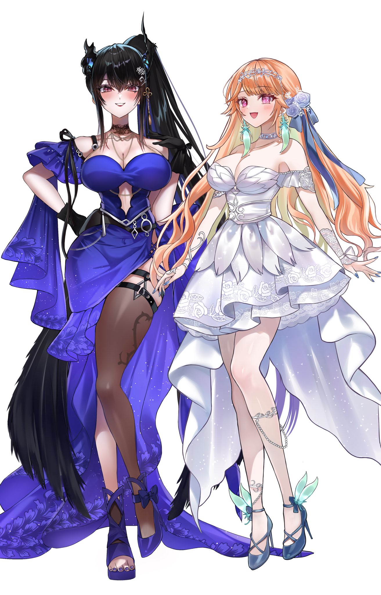2girlsbare shouldersblack hairblack thighhighsblue dressblue hairblushbreastscleavagedressfull bodygreen hairhigh ponytaillarge breastsmulticolored hairmultiple girlsorange hairponytailsingle thighhighthighhighstwo-tone hairvirtual youtuberwhite dress