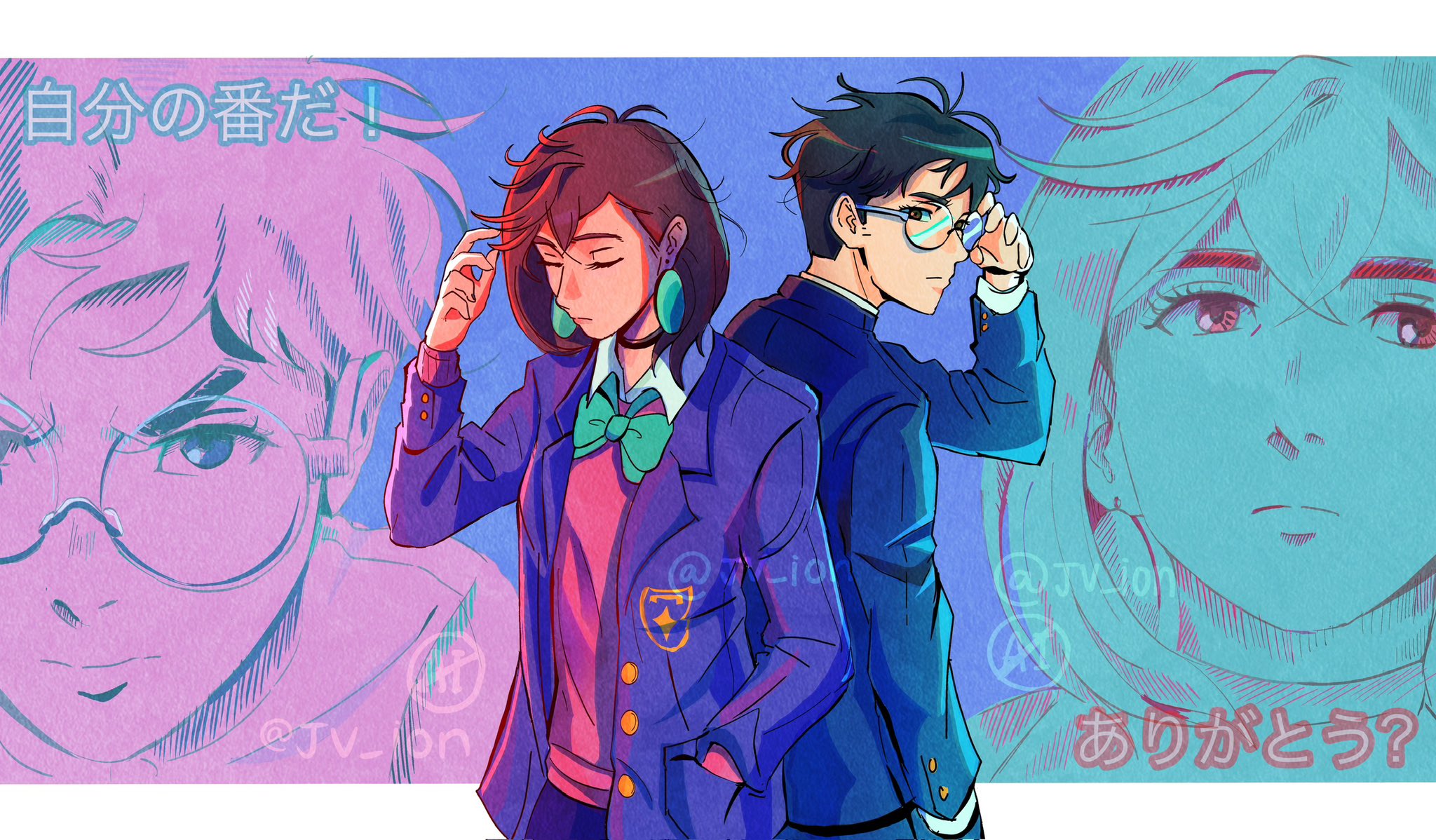 shrimperini, kel (faraway) (omori), kel (omori), sunny (omori), omori, highres, !, !!, 2boys, 2girls, alternate costume, alternate universe, anger vein, antenna hair, artist name, ball, basketball (object), black eyes, black hair, black jacket, black shoes, black sweater vest, blush, breasts, brown eyes, brown hair, brown shorts, brown skirt, chibi, choker, closed eyes, closed mouth, dark-skinned female, dark-skinned male, dark skin, double-parted bangs, ear piercing, emori (shrimperini), english text, face piercing, genderswap, genderswap (mtf), grin, holding, holding ball, hug, hug from behind, jacket, lip piercing, loafers, long sleeves, low twintails, medium hair, multiple boys, multiple girls, one eye closed, open mouth, orange shoes, orange shorts, piercing, pleated skirt, shirt, shoes, short hair, short sleeves, short twintails, shorts, skirt, small breasts, smile, sneakers, socks, speech bubble, sweater vest, teeth, tongue, tongue out, twintails, white shirt, white socks, yaoi, yuri