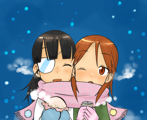 00s2girlsdrinkeyepatchglovesmultiple girlsone eye closedscarfshared clothesshared scarfsnowwinkyuri