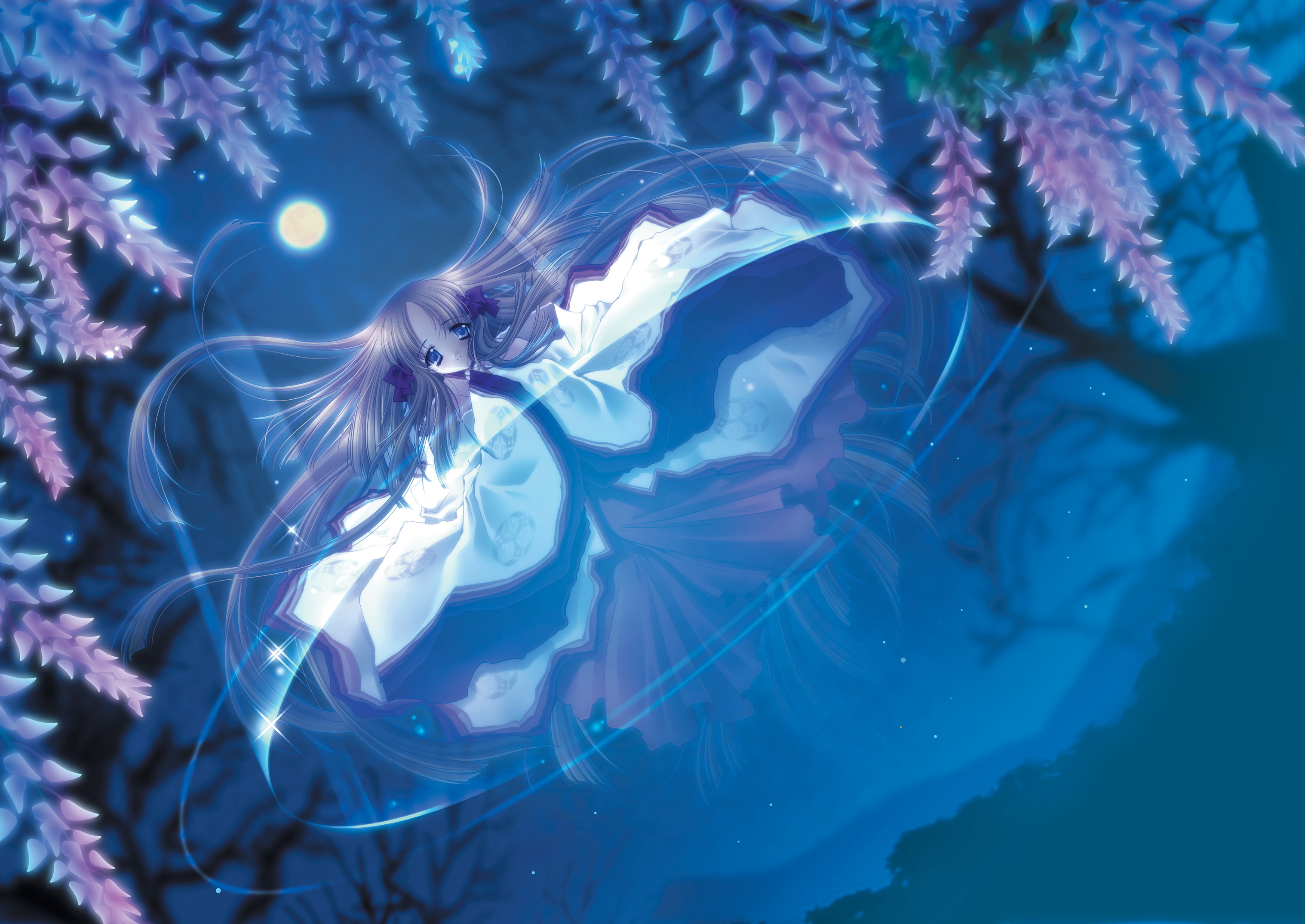 abremson, ryu (monster girl encyclopedia), monster girl encyclopedia, absurdres, highres, variant set, 1girl, antlers, breasts, bursting breasts, claws, cleavage, dragon, dragon claw, dragon girl, dragon horns, dragon tail, eastern dragon, floating, flying, forest, hair ornament, horns, huge breasts, japanese clothes, kimono, lake, levitation, long hair, magatama, magatama hair ornament, monster girl, mountain, nature, no bra, purple hair, slit pupils, tail, tree, very long hair, water, waterfall, yellow eyes