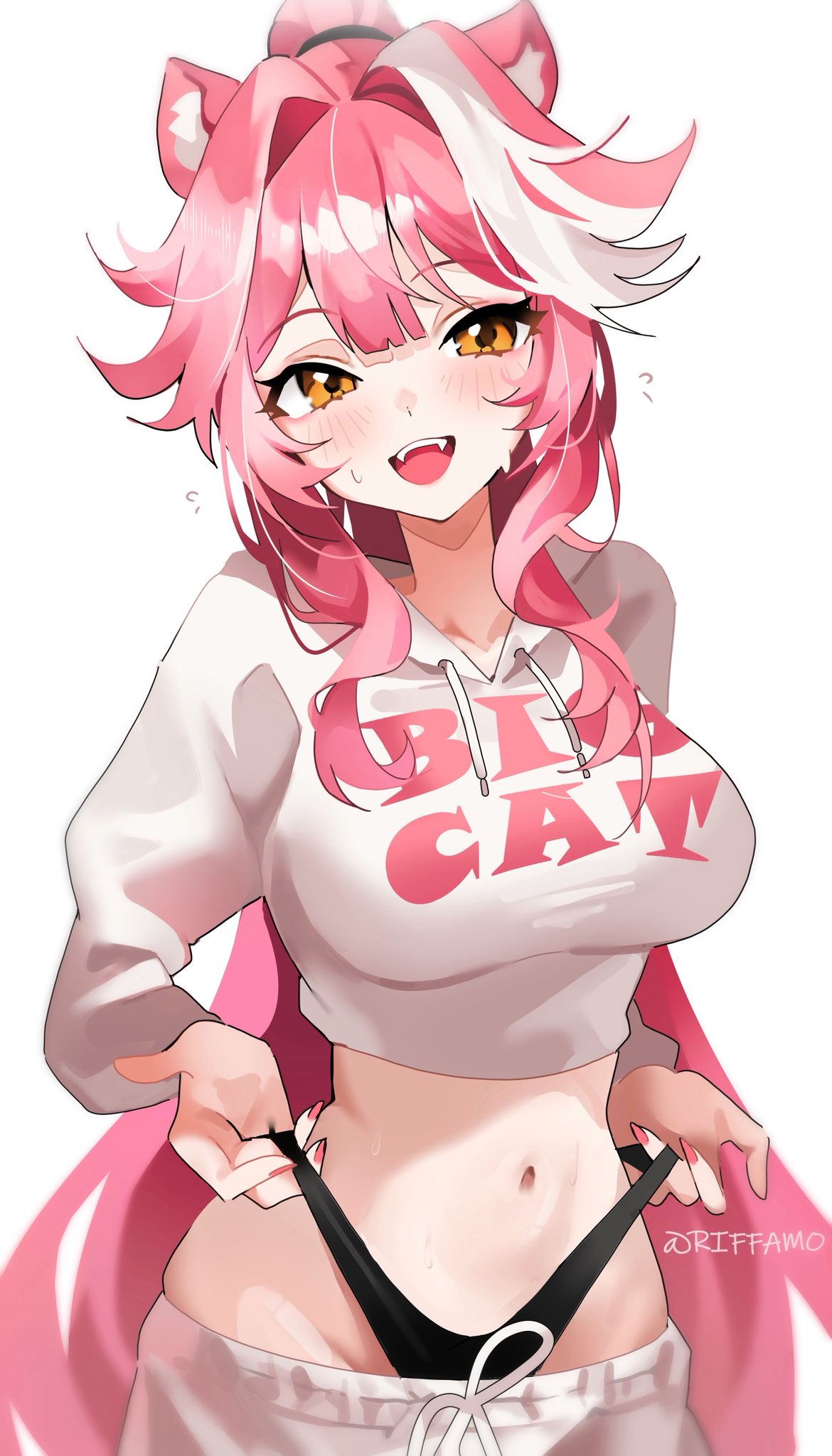 1girlanimal ear fluffanimal earsbreastsclothes writinghighleghoodhood downhoodielong hairmulticolored hairnavelopen mouthorange eyespanther earspanther girlpink hairpink nailssmilesolostomachstreaked hairsweattwitter usernamewhite backgroundwhite hairwhite hoodie