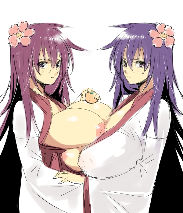 asymmetrical dockingbreast pressbreast restbreastshuge breastsjapanese clotheskimonolong hairnipplespurple hair