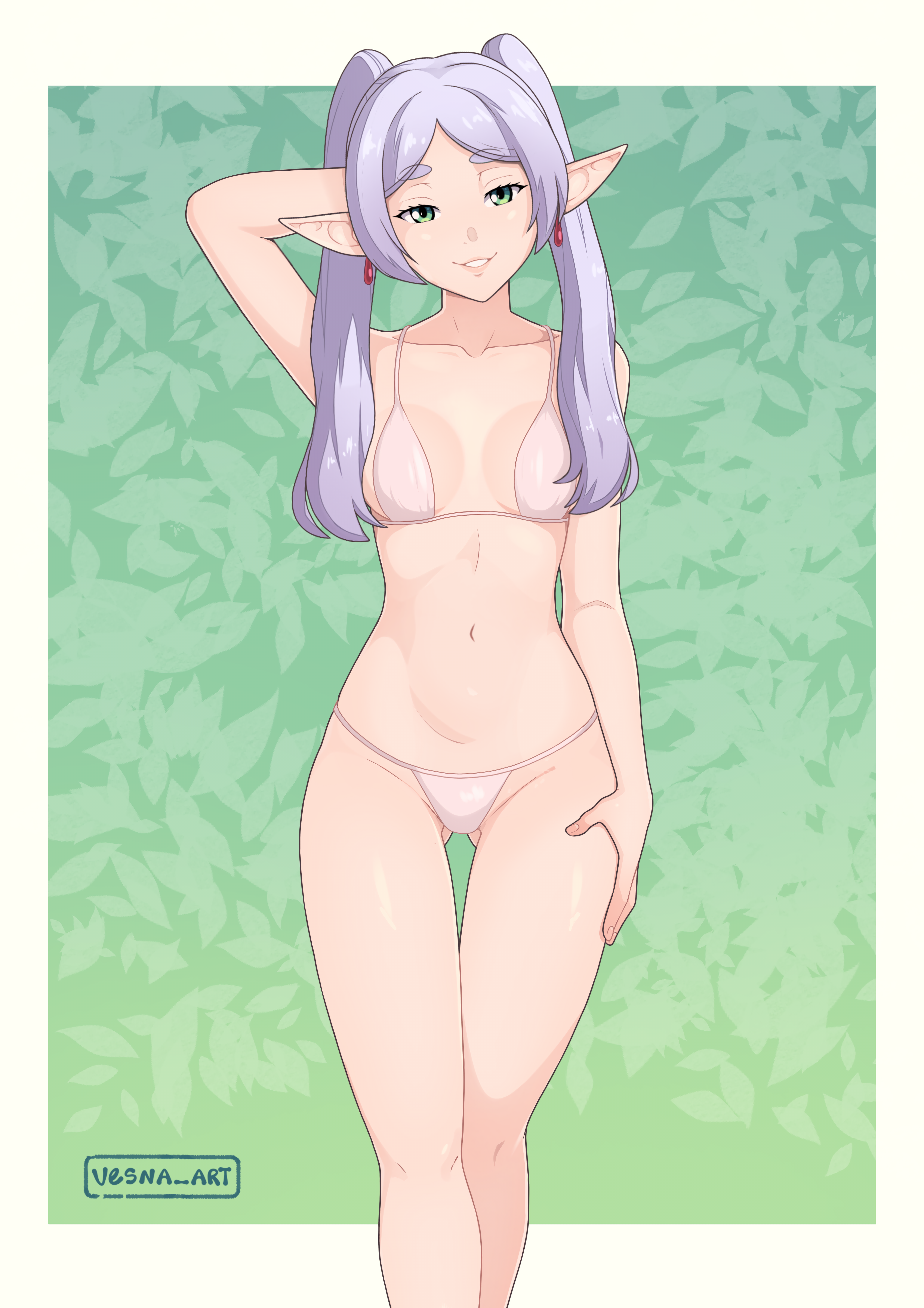 blue notuki, arcueid brunestud, tsukihime, absurdres, highres, 1girl, antenna hair, bare shoulders, bikini, blonde hair, blue background, border, breasts, cleavage, collarbone, cowboy shot, frilled bikini, frills, full body, large breasts, multiple views, navel, one eye closed, red eyes, short hair, simple background, standing, swimsuit, white bikini, white border